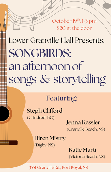 Join us at Lower Granville Hall for the first event in our Songbirds series, hosted by Katie Martí, a local writer and musician living down the road in Victoria Beach.